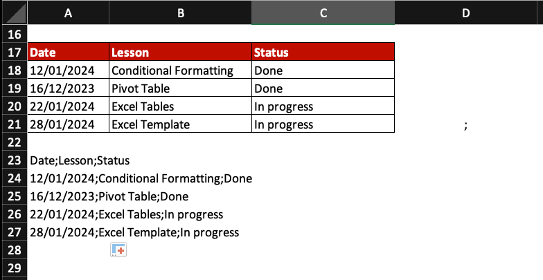 In this example, we want to convert columns A to C to semicolon separated text and we decide to use CONCAT. Here is how to do it:
