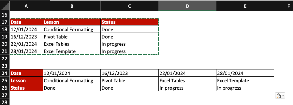 As a reminder, the TRANSPOSE formula is =TRANSPOSE(array) but here we want to transpose data and paste formatting too so we use the TRANSPOSE trick.